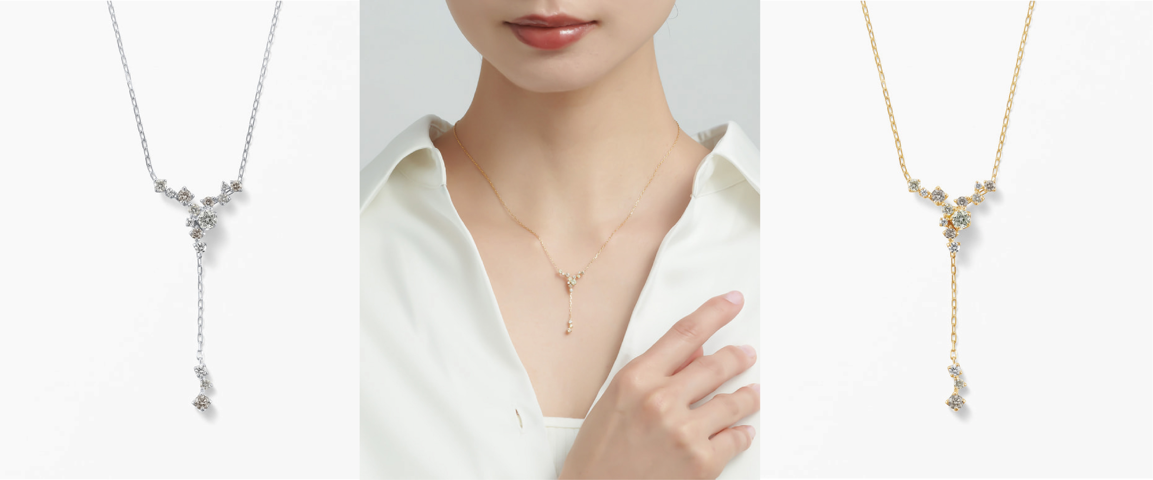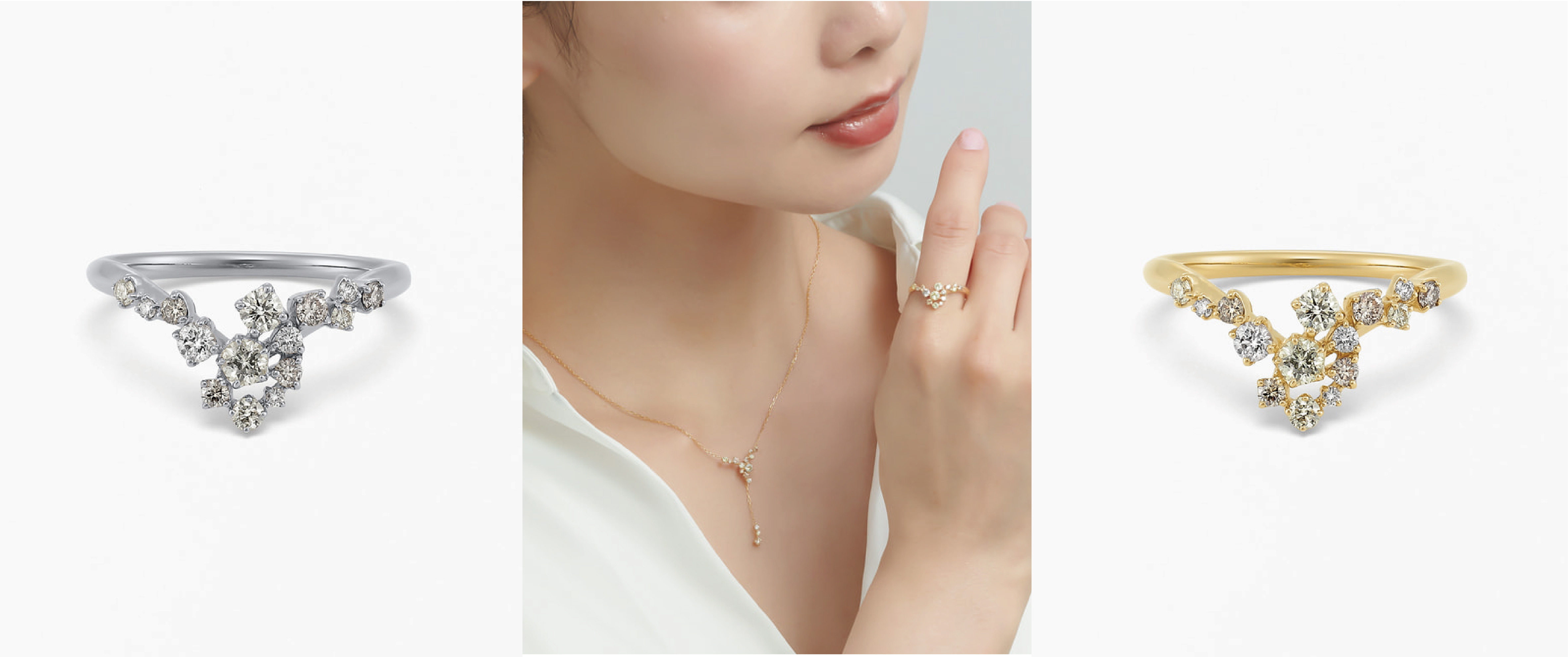 以 三種帶有淡雅色澤的鑽石 為主角,透過尺寸變化與層次深度的細膩調整,追求如自然流動般的和諧排列。