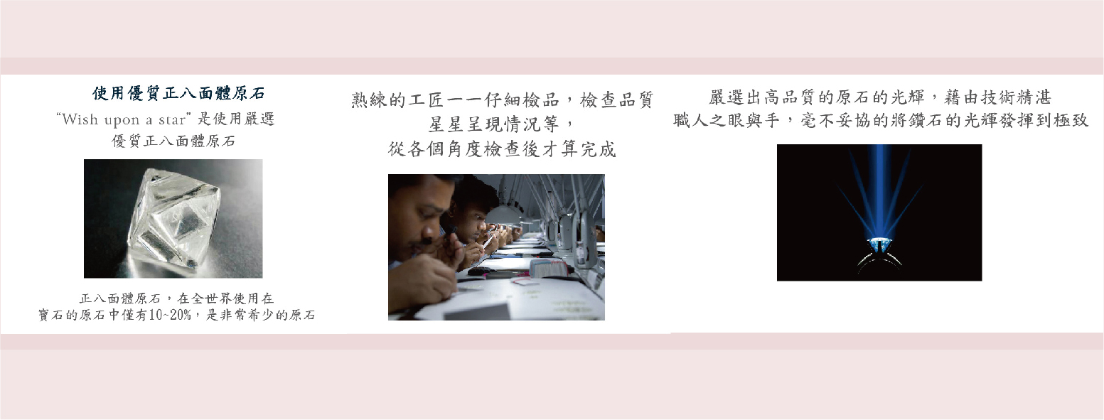 “Wish upon a star”diamond 是代表festaria對品質堅持的象徴,在光彩奪目的車工中,可以輝映出二個美麗星星的鑽石。